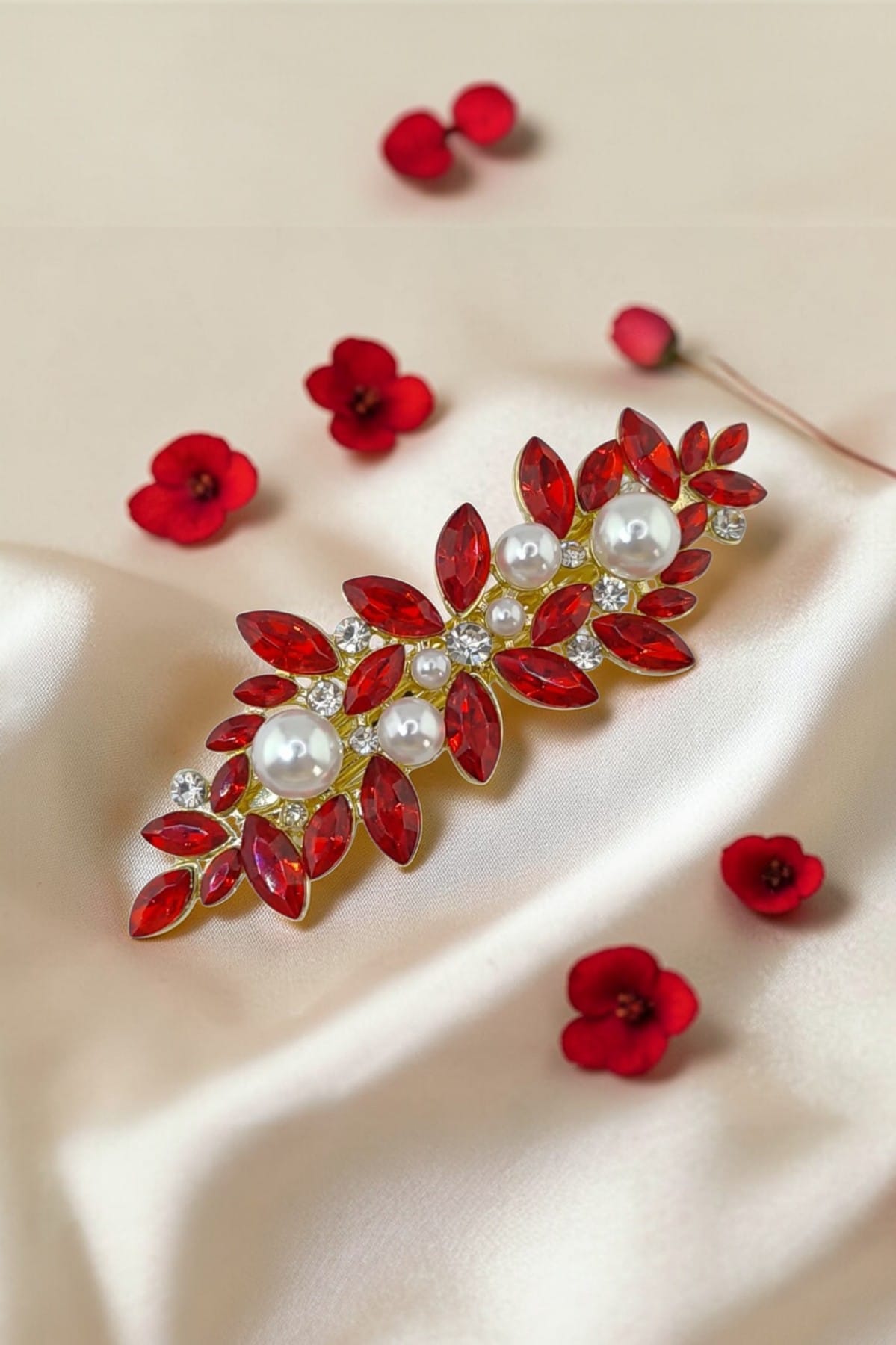 Çarpıcı ve Zarif Estetik: Kırmızı kristallerin dinamizmi ve incilerin naif duruşu, saçlarınıza yaprak formuyla romantik bir estetik kazandırır.