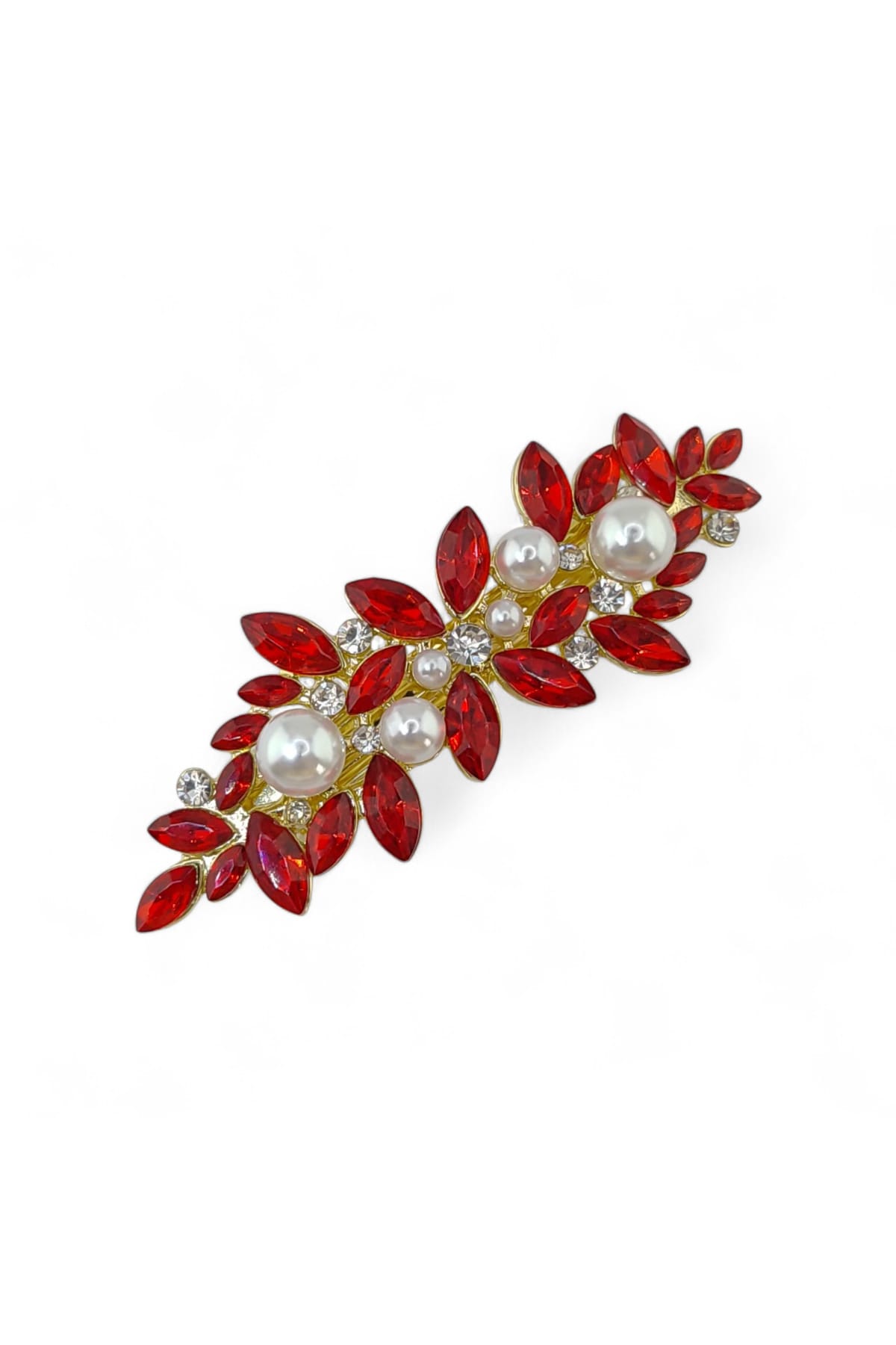 Bu çok yönlü aksesuar, gardırobunuzdaki farklı parçalarla eşsiz bir uyum yakalar. Kırmızı kristal ve inci detaylı yaprak tasarım saç tokası, kullanım amacınıza göre tarzınızı bir üst seviyeye taşır.